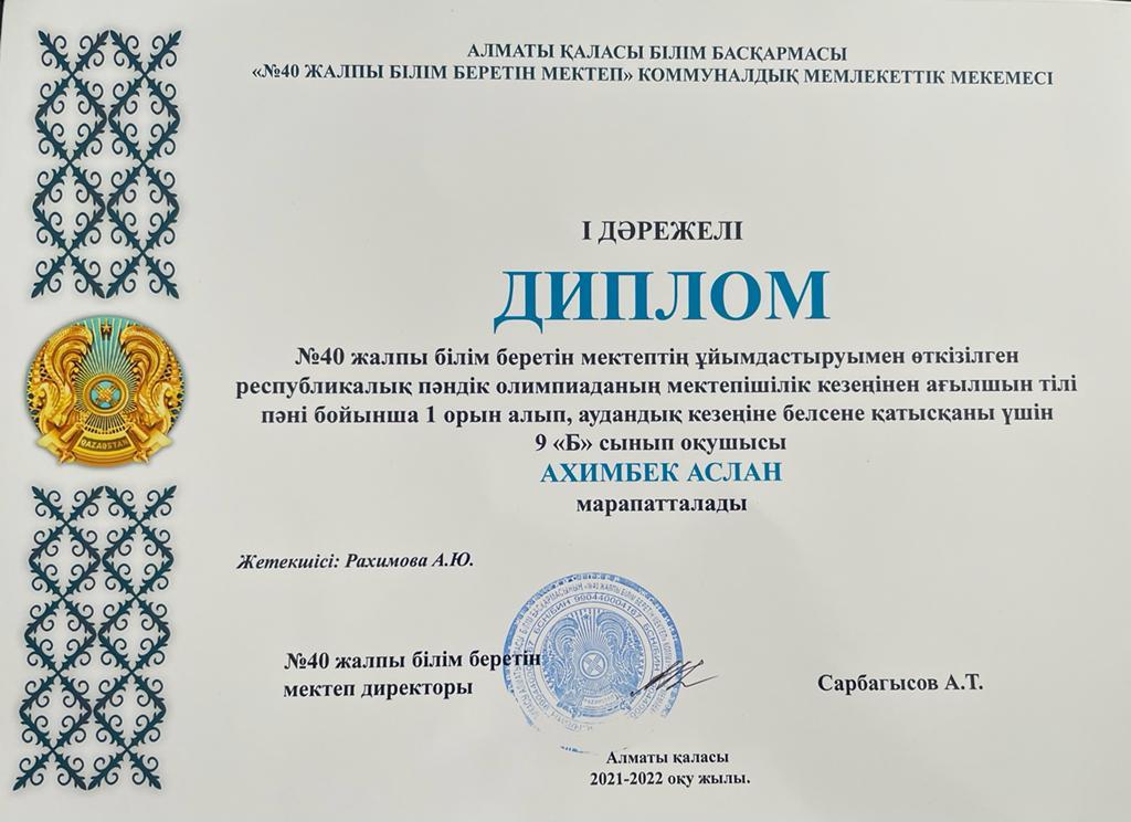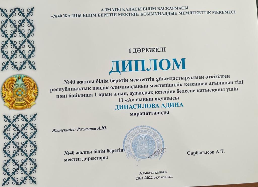 11 наурыз 2022 0 1 2 3 4 5 МЕКТЕПІШІЛК ОЛИМПИАДА РЕСПУБЛИКАЛЫҚ ОЛИМПИАДАНЫҢ МЕКТЕПІШІЛІК КЕЗЕҢІНЕ ҚАТЫСЫП АҒЫЛШЫН ТІЛІНЕН ЖҮЛДЕЛІ 1-ОРЫН ИЕЛЕНГЕН 11 "А" СЫНЫП ОҚУШЫСЫ ДИНАСИЛОВА АДИНА , 9 "Б" СЫНЫП ОҚУШЫСЫ АХИМБЕК АСЛАН