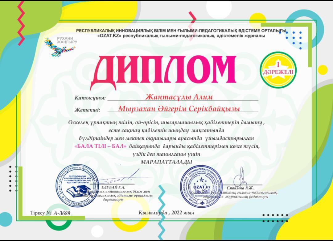 "БАЛА ТІЛІ-БАЛ" "OZAT.KZ" РЕСПУБЛИКАЛЫҚ ҒЫЛЫМИ-ПЕДАГОГИКАЛЫҚ ӘДІІСТЕМЕЛІК ЖУРНАЛЫНЫҢ ҰЙЫМДАСТЫРУЫМЕН ӨТКЕН БҮЛДІРШІНДЕР МЕН МЕКТЕП ОҚУШЫЛАРЫ АРАСЫНДА ҰЙЫМДАСТЫРЫЛҒАН БАЙҚАУҒА ҚАТЫСЫП 1-ДӘРЕЖЕЛІ ДИПЛОМ ИЕЛЕНГЕН №40 ЖББМ ОҚУШЫСЫ ЖАНТАСҰЛЫ АЛИМ