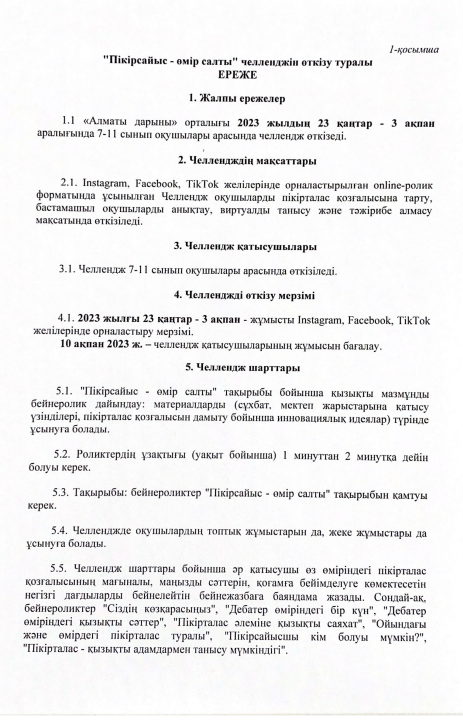 7-11 сынып оқушылар арасында "Пікірсайыс өмір салты" челлендж өткізіледі.