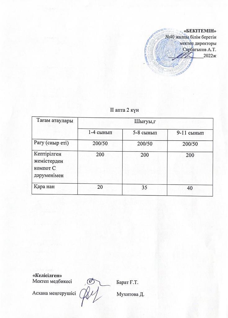 Бір күндік ас мәзірі. 1 апта 2 күн.