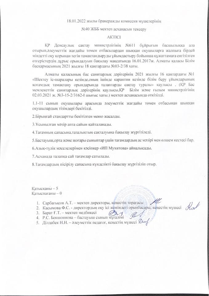 » Мектеп асханасын тексеру АКТІСІ 18.01.22 ж.